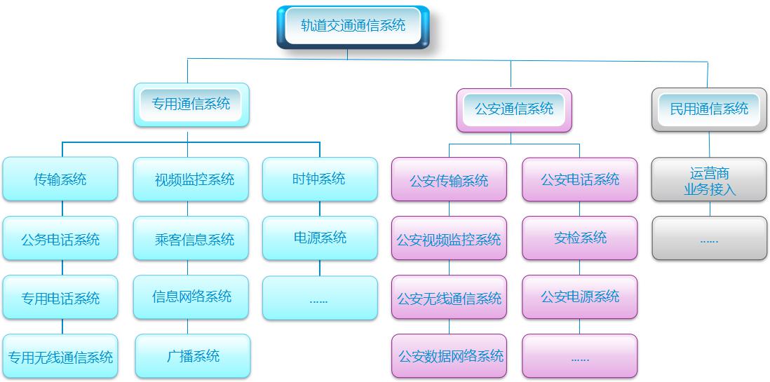城市轨道交通通信系统按使用主体可分为专用通信系统、公安通信系统和民用通信系统三大部分: