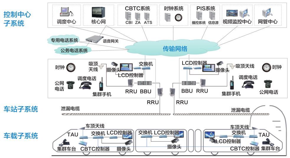 车载数据终端(TAU)提供车辆的数据接入,PIS、CCTV、CBTC车载设备可以通过交换机连接到TAU,实现车地无线传输。车载调度终端实现司机与调度员的调度通讯。